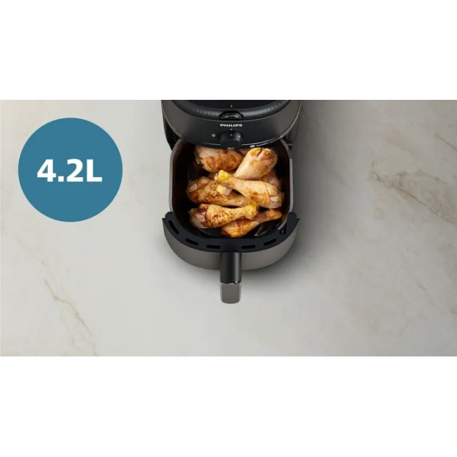 Компактна конструкція ідеально підходить для будь-якої кухні – як великої, так і малої. У 4,2-літрову піч поміщається до 500 г картоплі фрі, 6 курячих гомілок або 500 г овочів.