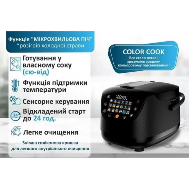 | Програми приготування | Рис Каша Суп Пара Кип'ятіння/стерелізація Тушкування Томління Смаження Торт Плов Йогурт Хліб Макарони Молочна каша Су-від Мультишеф Випічка |