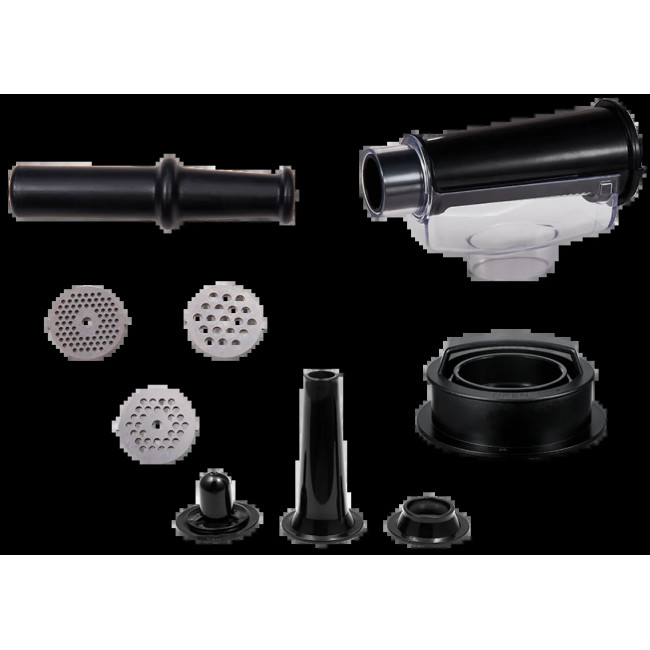 - Аксесуари: 3 диски для помелу (3 мм/5 мм/7 мм), насадка для ковбас, насадка для кебе, соковитискач для томатів, бургер-прес, штовхач, металевий лоток