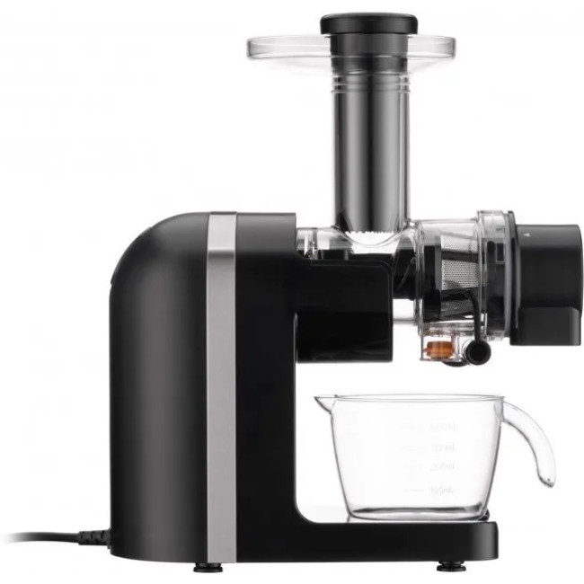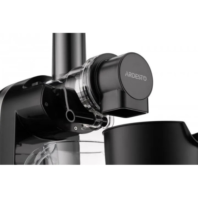 Модель у чорному пластиковому корпусі має металеві елементи, що елегантно доповнюють загальний дизайн. Комплектовання разом із пристроєм містить два контейнери: для соку об’ємом 400 мл і більш ємний (700 мл) для м’якоті. Під час подрібнення інгредієнти поділяються на сік і вичавки за допомогою сітчастого фільтра: сік проходить через фільтр і потрапляє до однієї чаші, вичавки — до іншої. Також доступна функція реверса. Всі пластикові елементи ARDESTO JEG-1500S вироблено з тритану, що не містить шкідливих для здоров’я речовин, зокрема BPA.