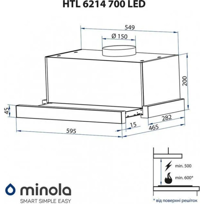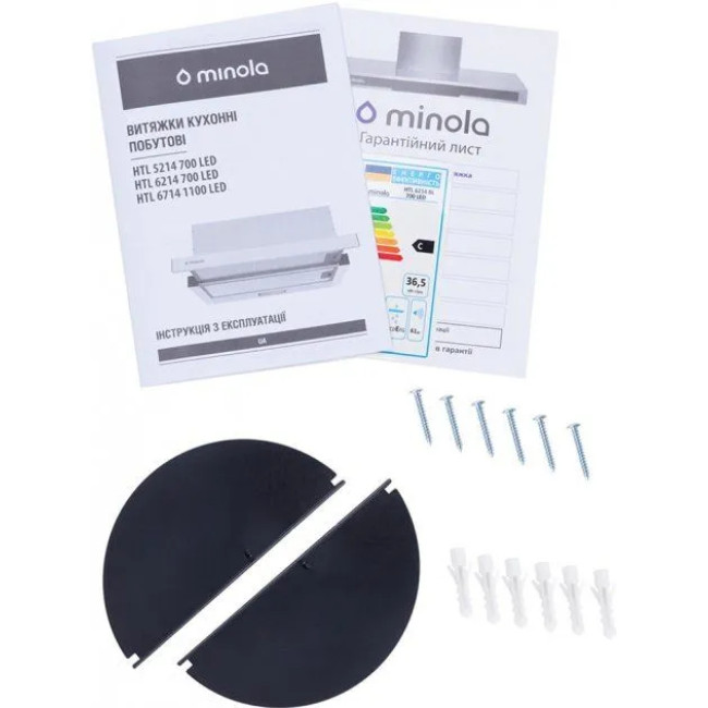 Витяжка MINOLA HTL 6214 BL 700 LED зроблена в досить практичному форм-факторі — телескопічному. Суть такої конструкції полягає в тому, що, крім основної частини, вона ще й має додаткову висувну панель. Таке доповнення допомагає розширити робочу площу, давши змогу витяжці ефективніше виконувати свої обов'язки.