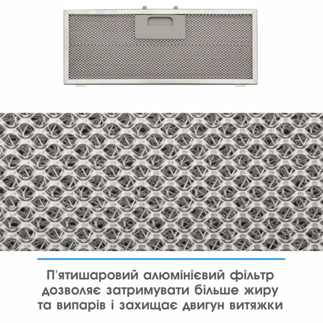 Прочный 5-слойный алюминиевый фильтр поглощает жир, грязь, мелкие посторонние частицы и защищает двигатель капота. Для удобства очистки достаточно снять его и помыть в горячей воде или посудомоечной машине.